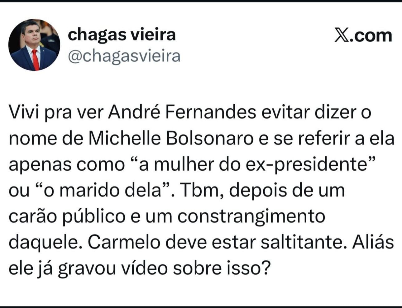 “Vivi pra ver André Fernandes evitar dizer o nome de Michelle Bolsonaro e se referir a ela apenas como ‘a mulher do ex-presidente’ ou ‘o marido dela’. Tbm, depois de um carão público e um constrangimento daquele. Carmelo deve estar saltitante. Aliás, ele já gravou vídeo sobre isso?”