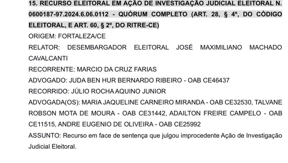 O Tribunal Regional Eleitoral do Ceará (TRE-CE) cassou, nesta segunda-feira dia 18 de agosto 2025, por abuso do poder econômico, o mandato do suplente de vereador Júnior Aquino (Avante).