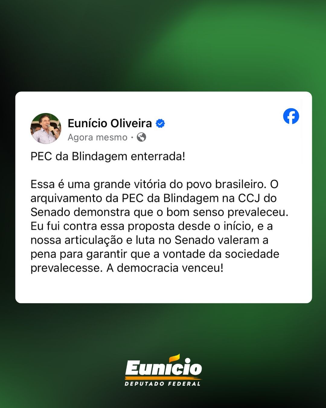 O deputado federal e pré-candidato ao Senado pelo MDB, Eunício Oliveira, celebrou nesta quarta-feira dia 24 de setembro 2025, a decisão da Comissão de Constituição e Justiça (CCJ) do Senado Federal de sepultar a chamada PEC da Blindagem.